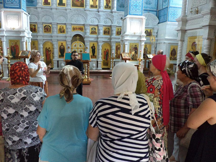 Всех гостей встретил клирик Старо-Покровского храма диакон Андрей Трофименко и с помощью переводчика жестового языка Ирины Крот познакомил глухих и слабослышащих экскурсантов с историей, чтимыми иконами и другими святынями храма. После этого инвалиды по слуху имели возможность помолиться в храме и поставить свечи.