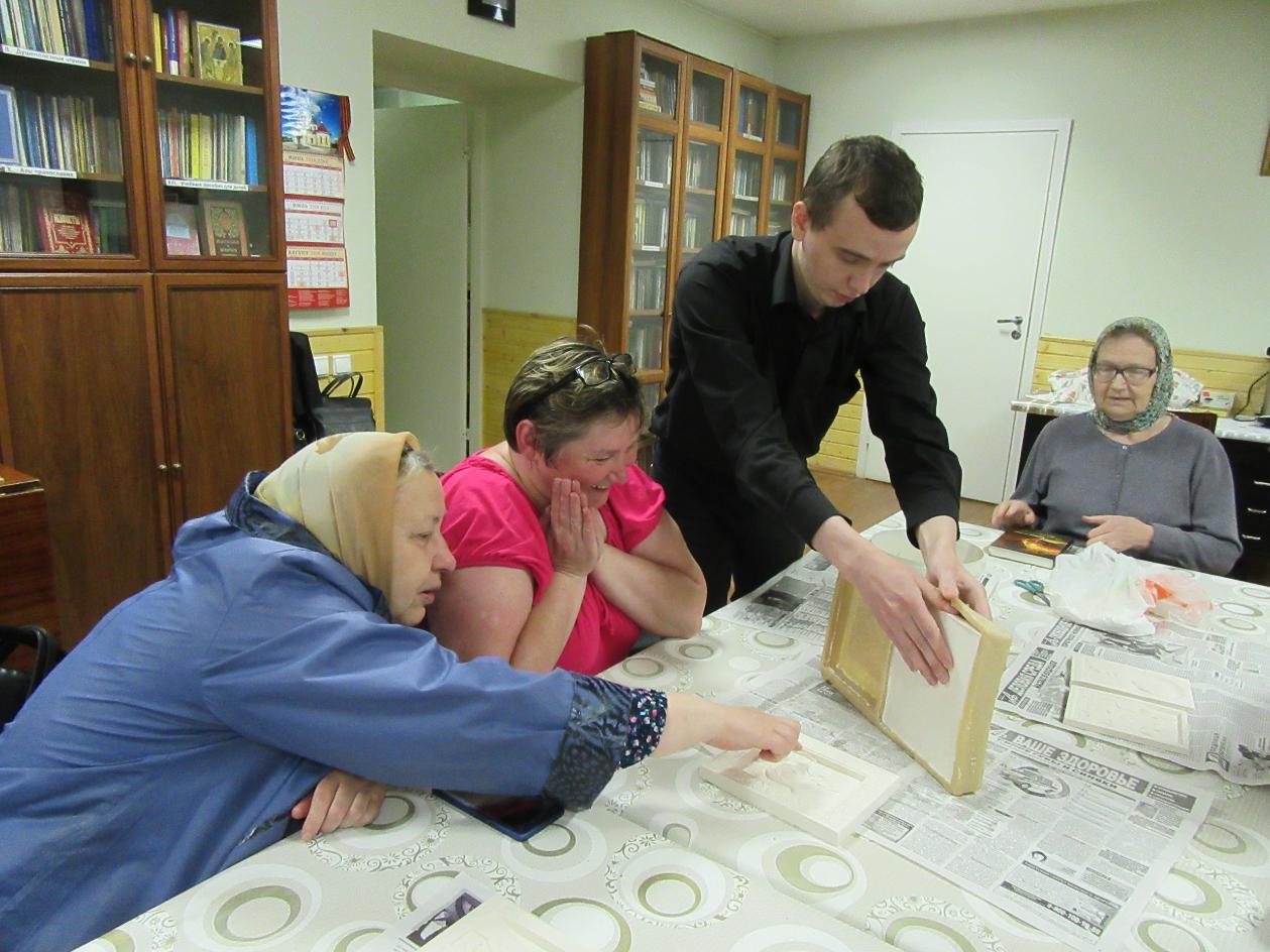 Его участники отливали из гипса специальные рельефные иконы, доступные для тактильного восприятия слепых и слепоглухих людей. Эти иконы делаются при храме уже несколько лет. Волонтеры отливают их в специальные формы, покрывают лаком, а после освящения дарят людям, имеющим нарушения зрения.В этот раз при создании таких икон впервые присутствовали инвалиды по слуху, которые с большим энтузиазмом отнеслись к идее помочь тем, кто не может увидеть икону. Вместе с приходскими волонтерами и сурдопереводчиками они самостоятельно сделали несколько икон: Пресвятой Троицы, Богородицы, Сергия Радонежского, Николая Чудотворца, а также покровителя храма - великомученика и целителя Пантелеимона.