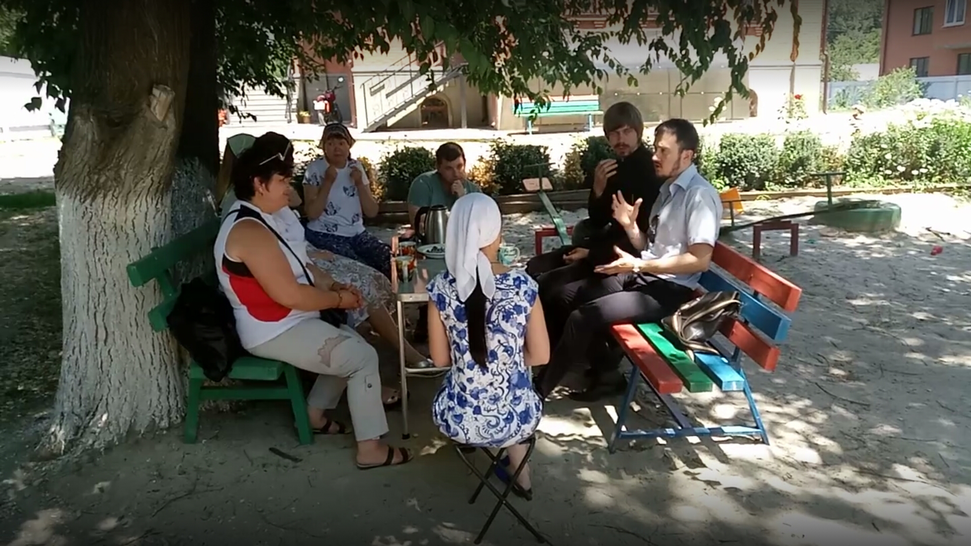 Собрание было решено провести на свежем воздухе за чаепитием. Встреча началась с общей молитвы на жестовом языке.